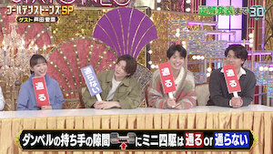 Guests Sho Sakurai and Sho Nakata compete in games that test their sense of size and ability to identify rapidly spinning objects at a mere glance.