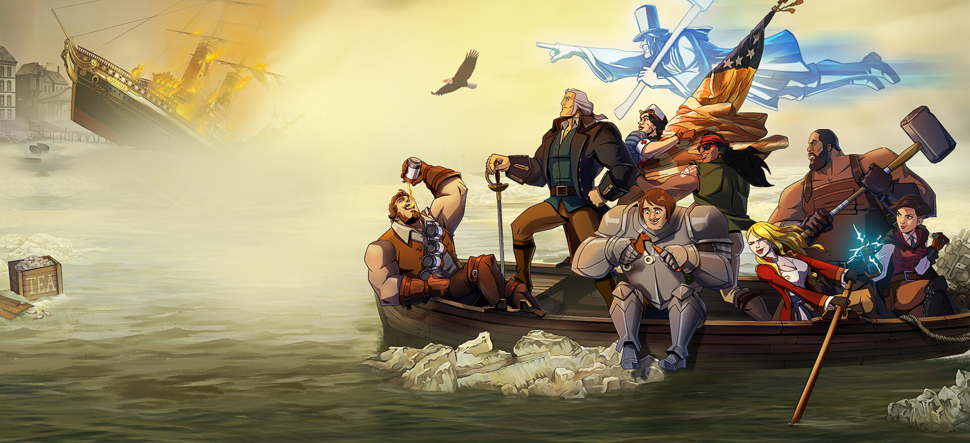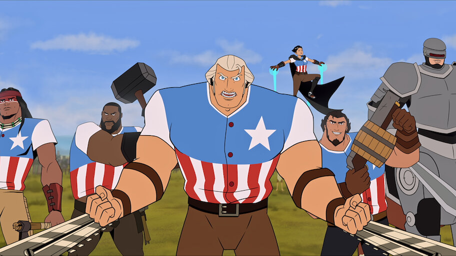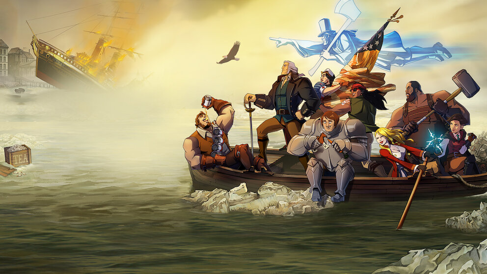George Washington y su compa Sam Adams —armados de motosierra y cerveza— se unen para derrotar a los británicos en esta versión burlesca de la Revolución estadounidense.