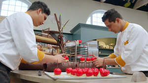 In the grand finale, three teams of pastry pros whip up stylish chocolate party hats and award-worthy miniature desserts.